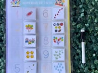 Material estruturado para ensinar os numerais de 1 a 10 por meio da associação entre número, quantidade e imagem. As crianças contam, reconhecem e treinam a escrita com canetinha em fichas plastificadas e reutilizáveis.